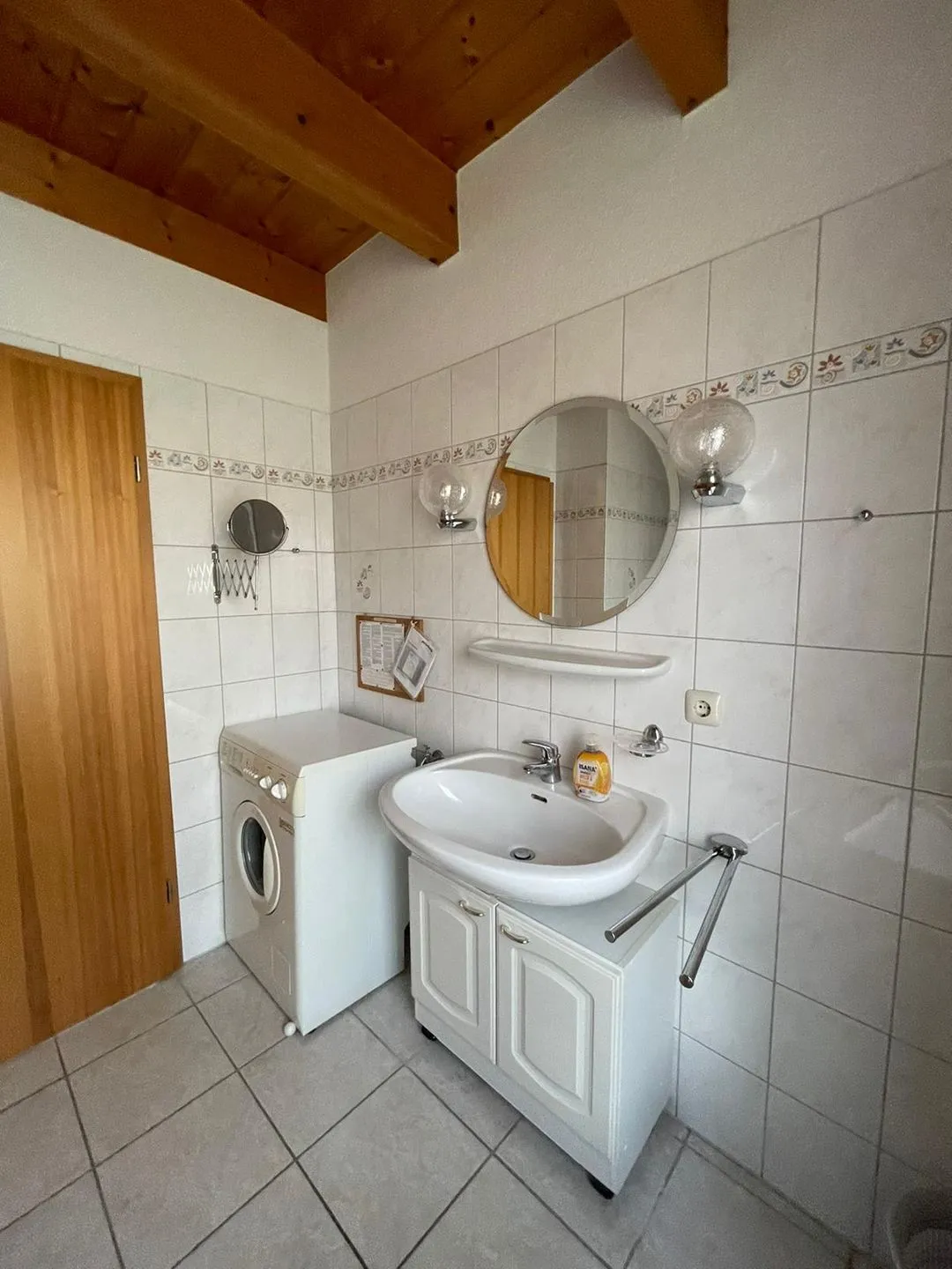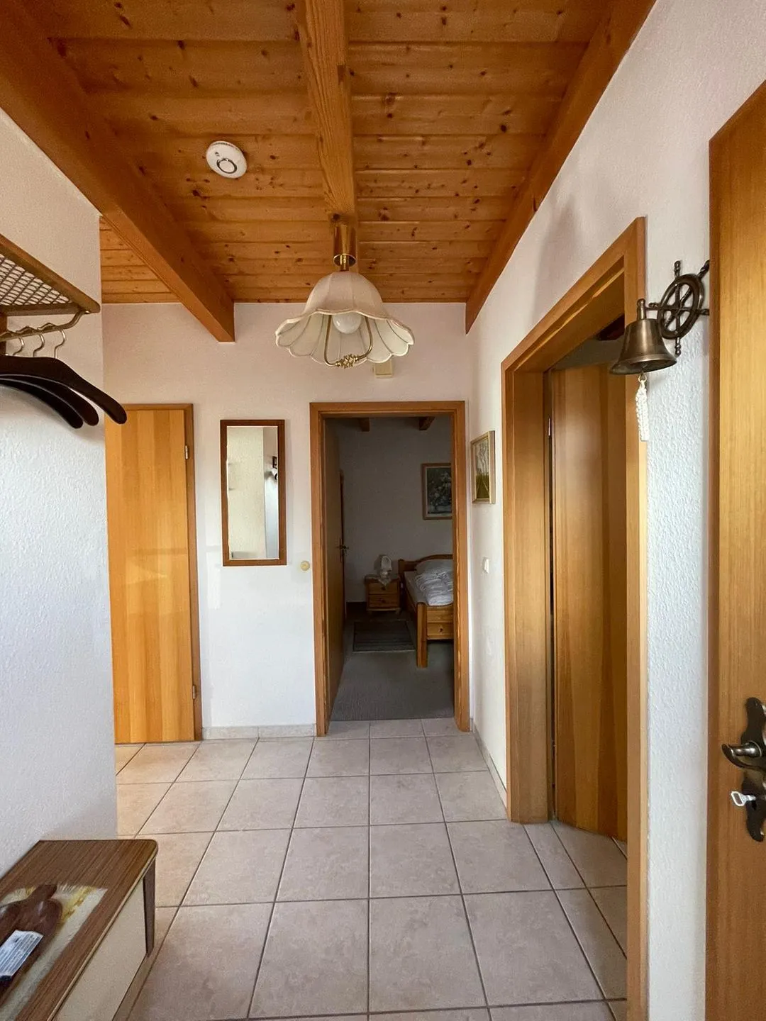 Im Erdgeschoß liegt ebenfalls das helle Duschbad mit Toilette und Waschtisch. Hier steht auch eine Münzwaschmaschine. Nebenan befindet sich ein Schlafzimmer mit Doppelbett.