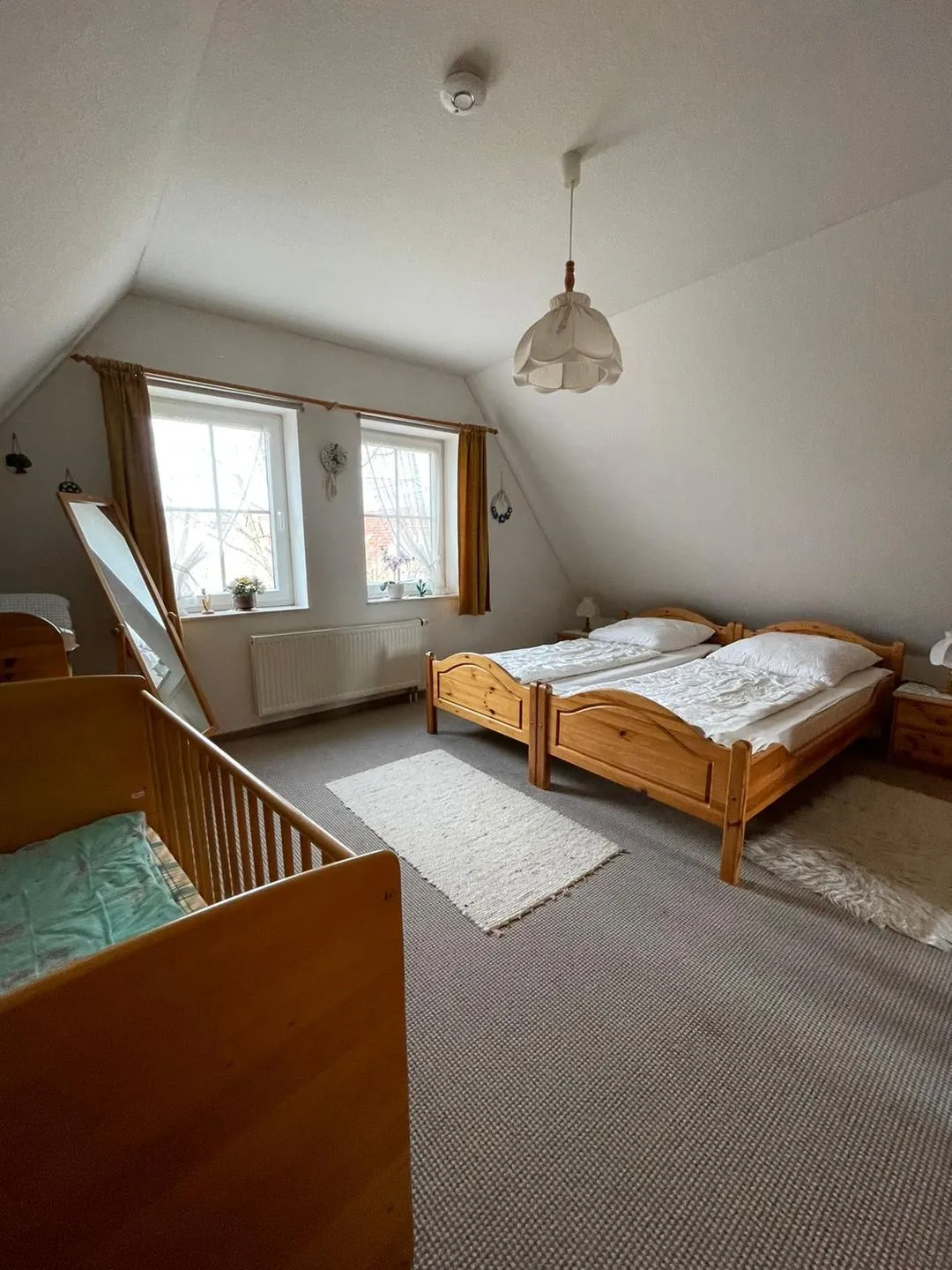 Im Obergeschoß stehen Ihnen noch 2 weitere Schlafzimmer, eines mit Doppelbett und eines mit 2 Einzelbetten zur Verfügung. Ein Kinderbettchen + Wickeltisch komplettiert den Familienurlaub. Zusätzlich befindet sich hier ein zweites Badezimmer mit Dusche , WC und Handwaschbecken. Kostenloses WLAN ist verfügbar!