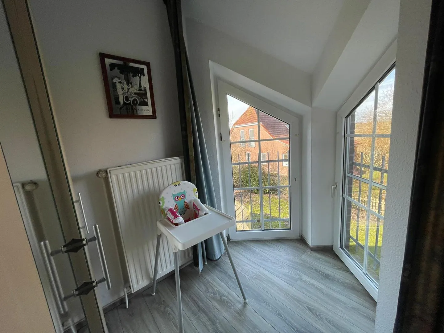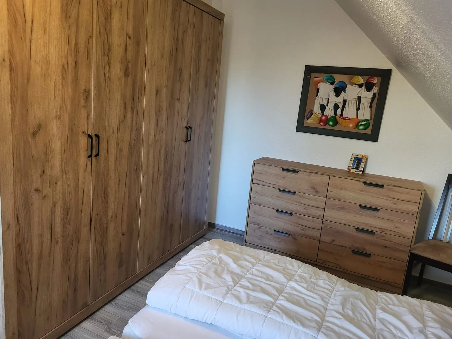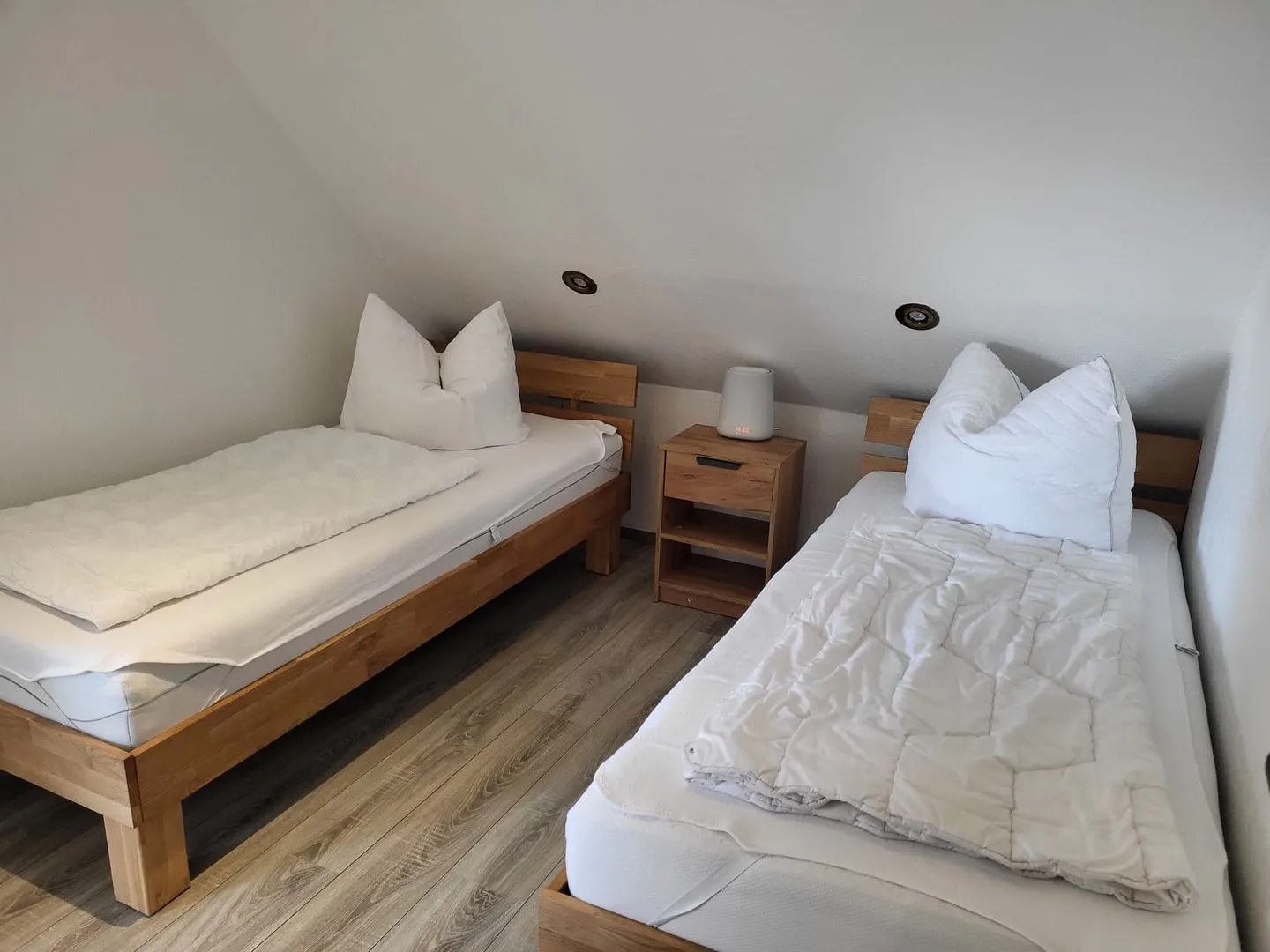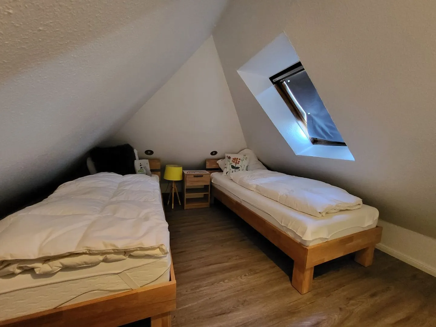 Im Obergeschoss befindet sich ein Schlafzimmer mit Doppelbett. Hier können Sie entspannte Nächte verbringen. Ein Fernseher steht dort bereit. Das zweite Zimmer mit Erker ist mit 2 Einzelbetten ausgestattet. Das Duschbad mit Waschmaschine u. Trockner liegt ebenfalls im OG. Ein dritter offener Schlafbereich mit zwei Einzelbetten befindet sich Dachgeschoß.