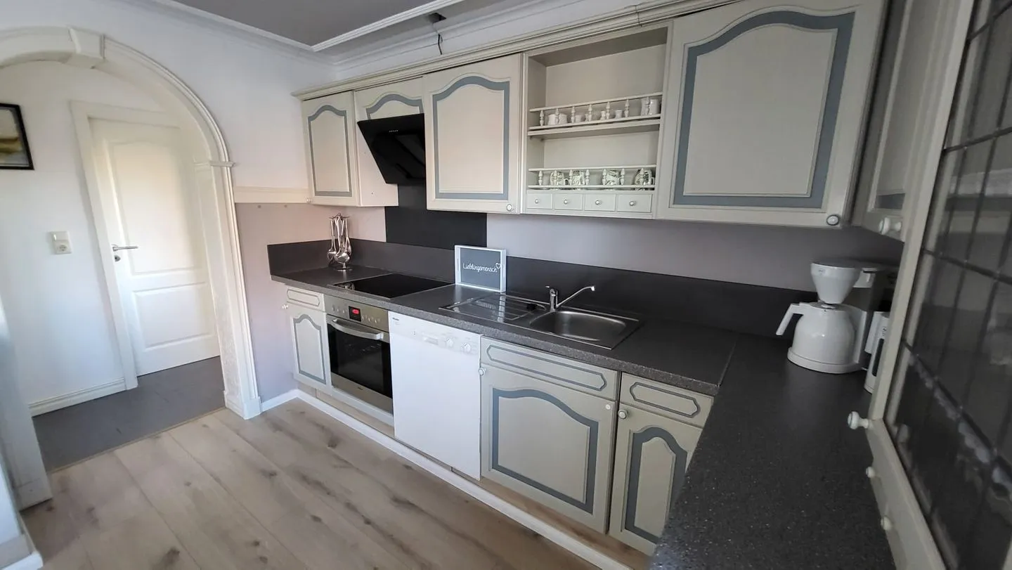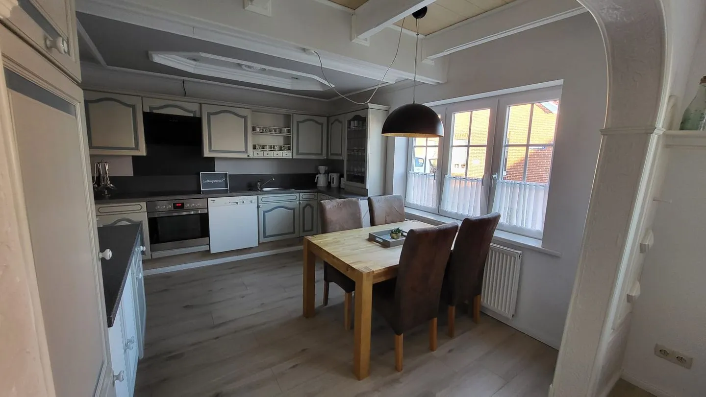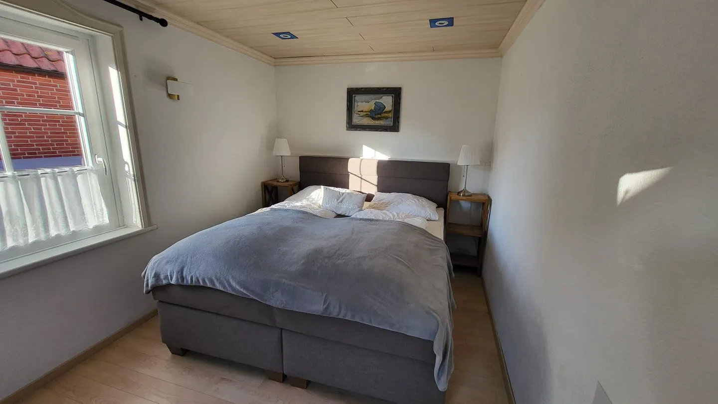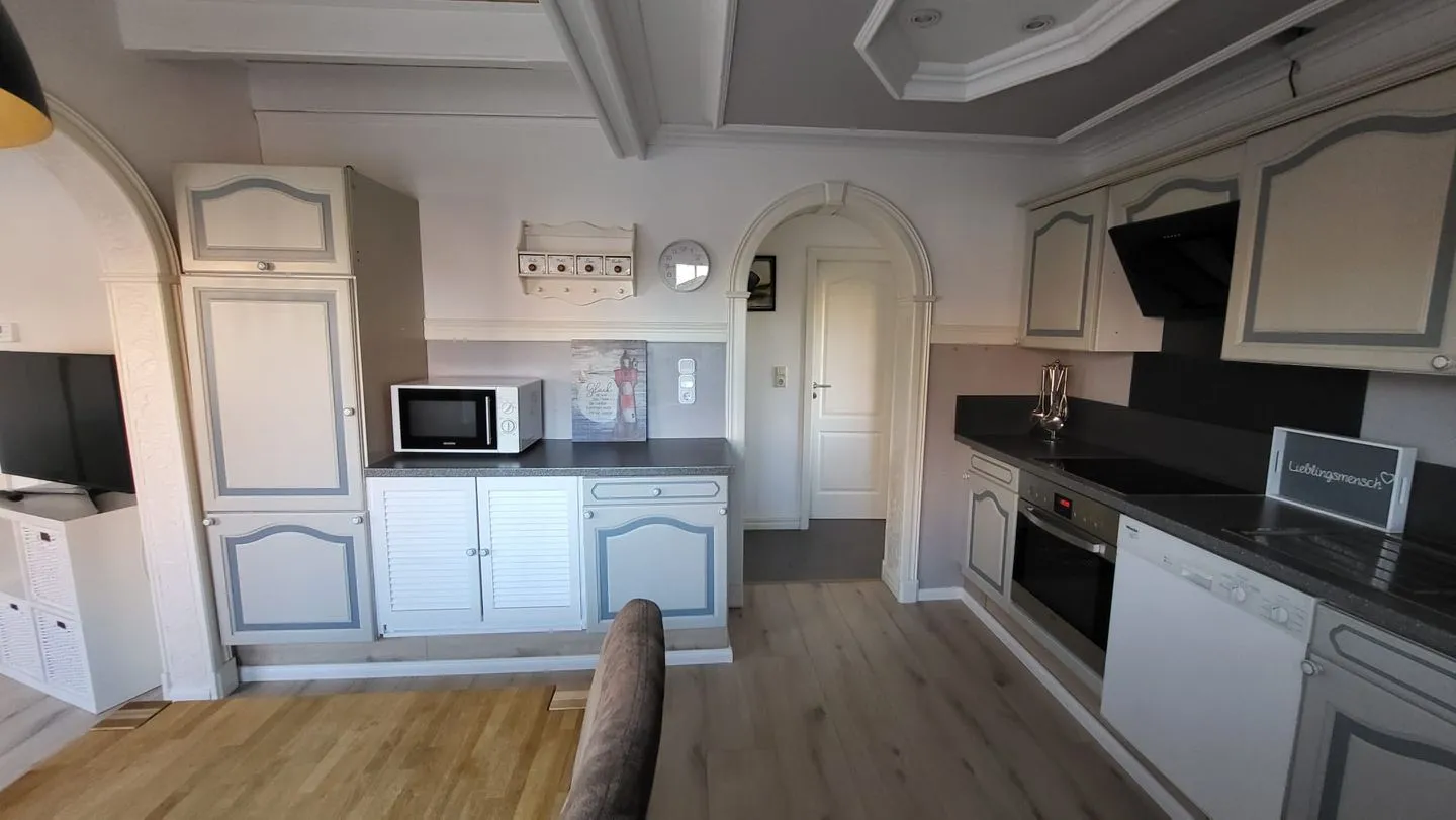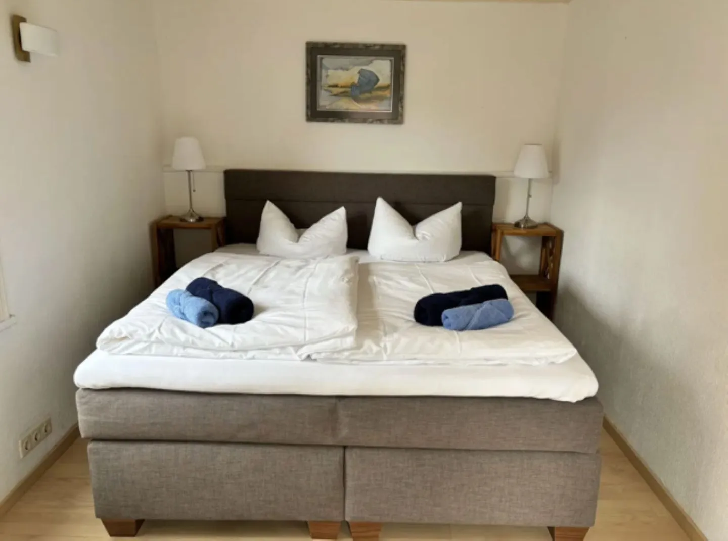 Vom Eingangsbereich gelangen Sie direkt in das helle Hauptschlafzimmer mit komfortablem Boxspringbett (bitte ein großes Spannbettlaken 180 × 200 cm mitbringen). Genießen Sie hier erholsame Nächte. Gegenüber befindet sich der großzügige Wohn- und Essbereich mit offener Küche. Die sichtbare Balkenlage und die gemütliche Einrichtung schaffen eine warme, einladende Atmosphäre. Auf den bequemen Sofas lassen sich entspannte Abende bei einem Glas Wein oder einem romantischen Film genießen.