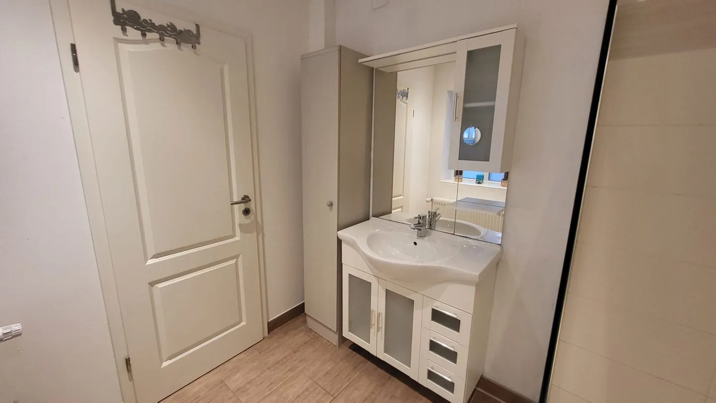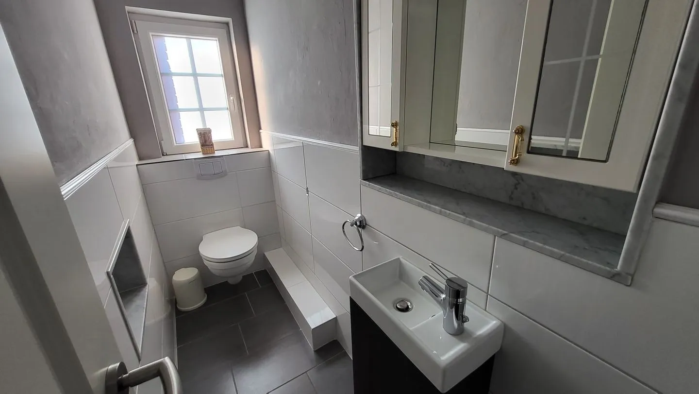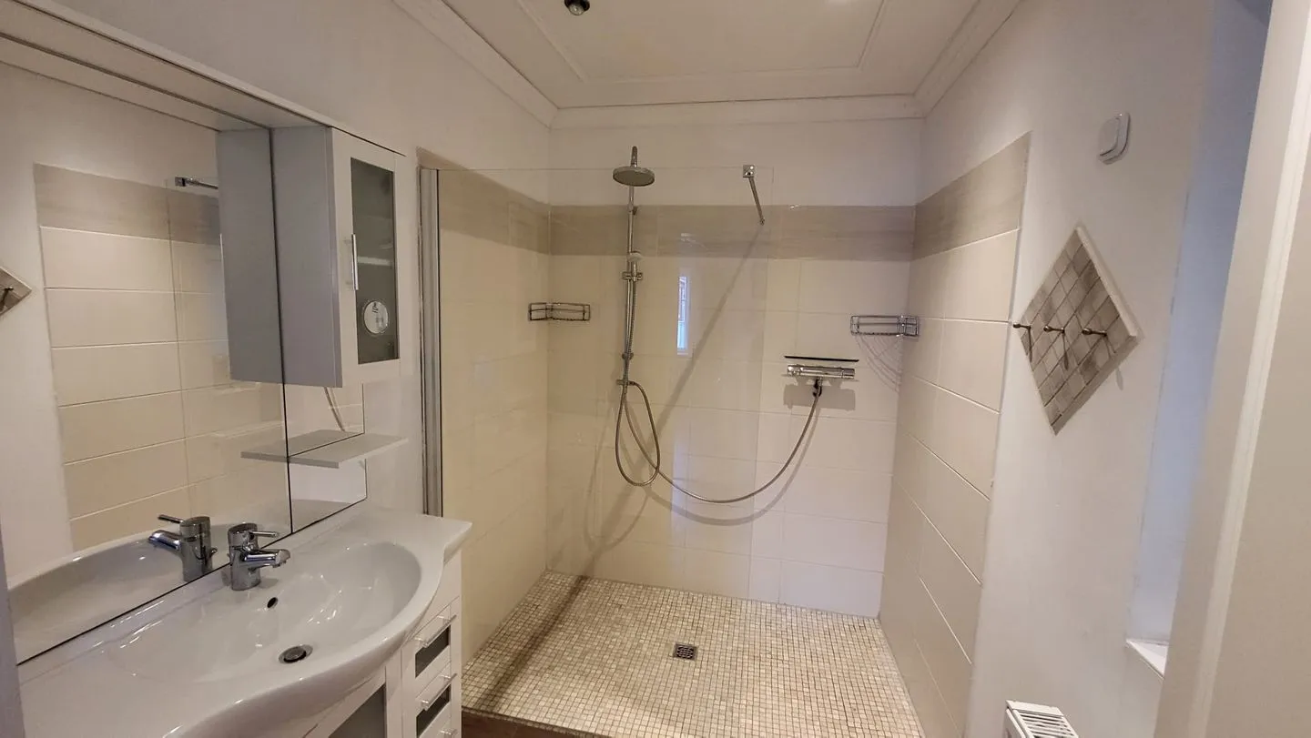 Ein modernes Duschbad mit großer, bodengleicher Dusche und ein neuwertiges Gäste-WC komplettieren das Erdgeschoss.