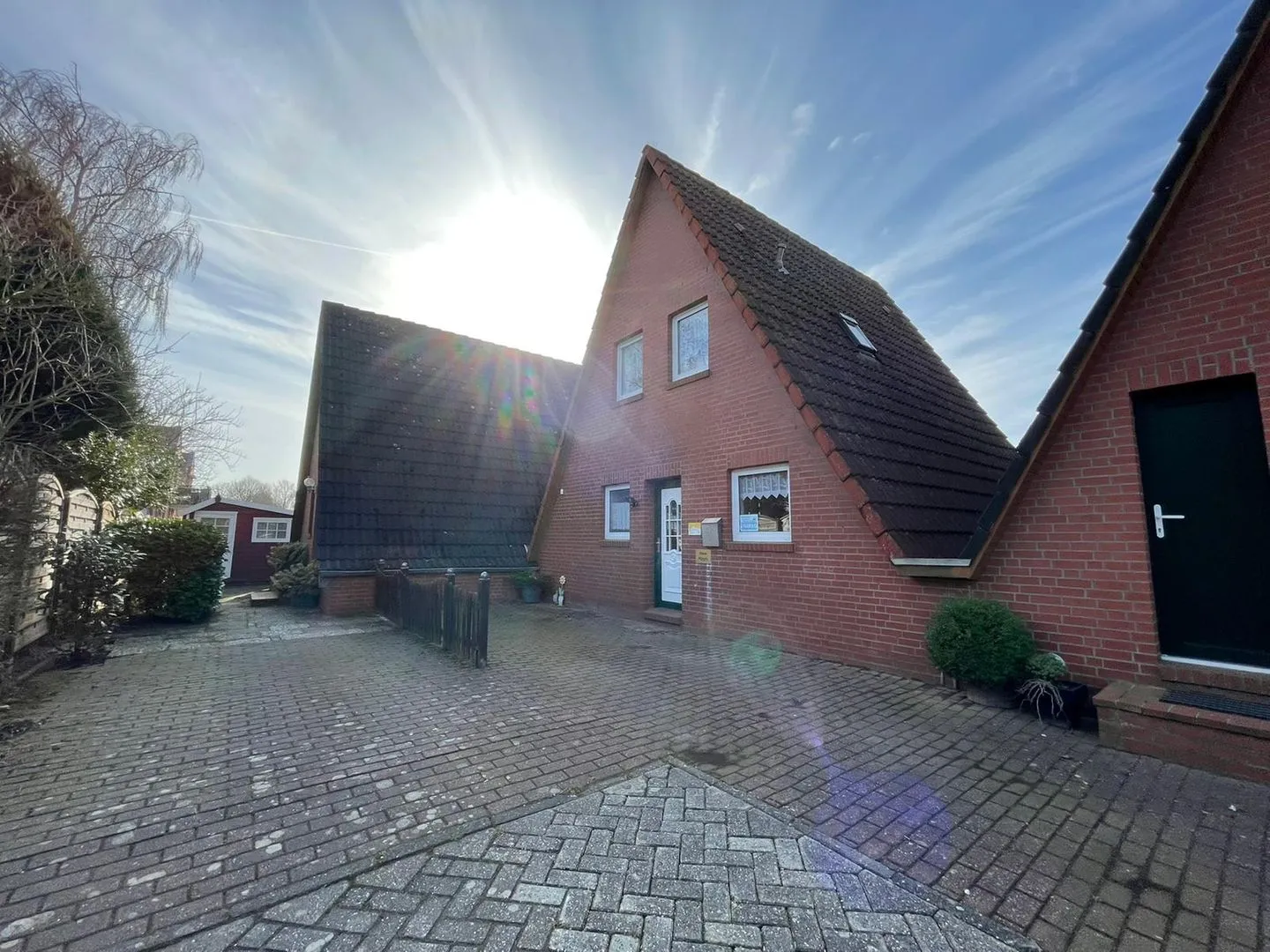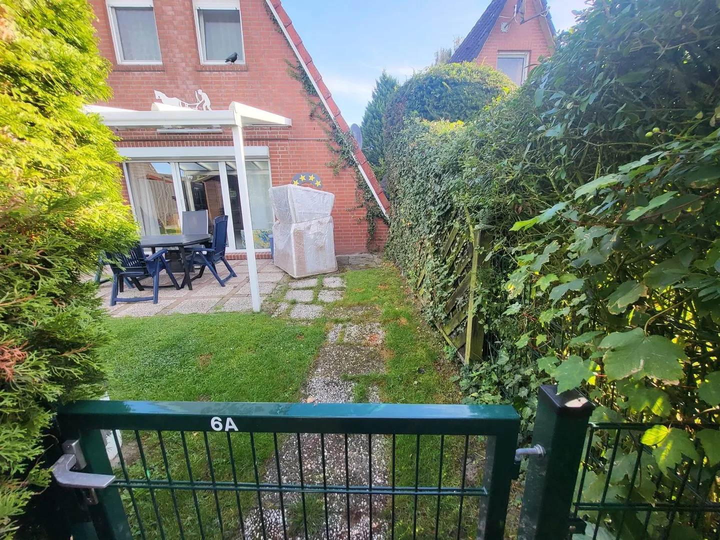 Parkplatz am Haus. Garten mit Terrassenüberdachung. Gartenhaus zum Unterstellen von Fahrräder, Strandkorb.