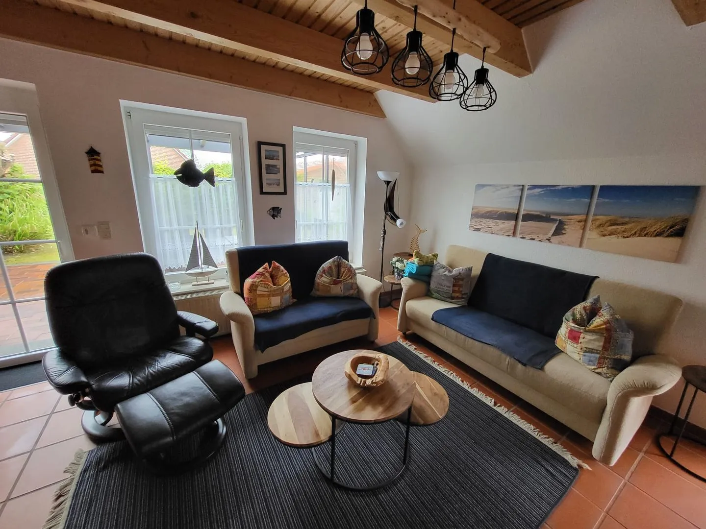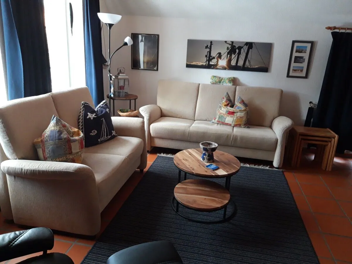 Des Weiteren liegt im EG eine vollausgestattete Küche mit gemütlichem Essbereich im ostfriesischen Stil. Der Wohnbereich mit Blick in den Garten lädt zum Entspannen und Verweilen ein. Von hier aus haben Sie Zugang zur schönen Sommerterrasse. Genießen Sie die frische Nordseeluft!