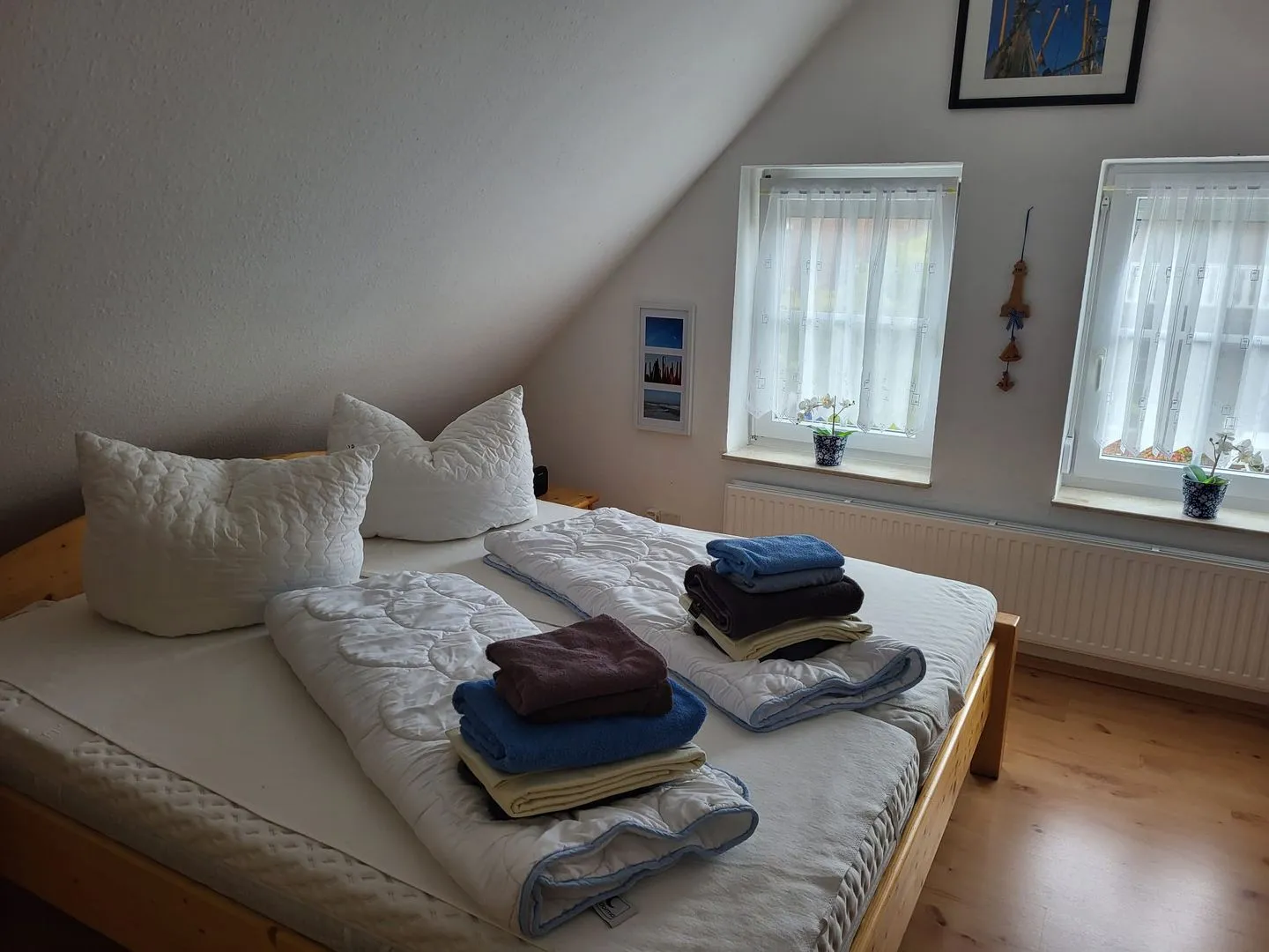 Im Obergeschoss finden Sie ein Schlafzimmer mit einem Doppelbett (+Babybett), sowie ein Schlafzimmer mit zwei Einzelbetten und ein zusätzliches Gäste-WC. Außenrollos in den Schlafräumen sorgen für ruhige Nächte. Beide Räume sind mit Einbaukleiderschränken ausgestattet. WLAN ist verfügbar! 2 Parkplätze stehen am Haus zur Verfügung.