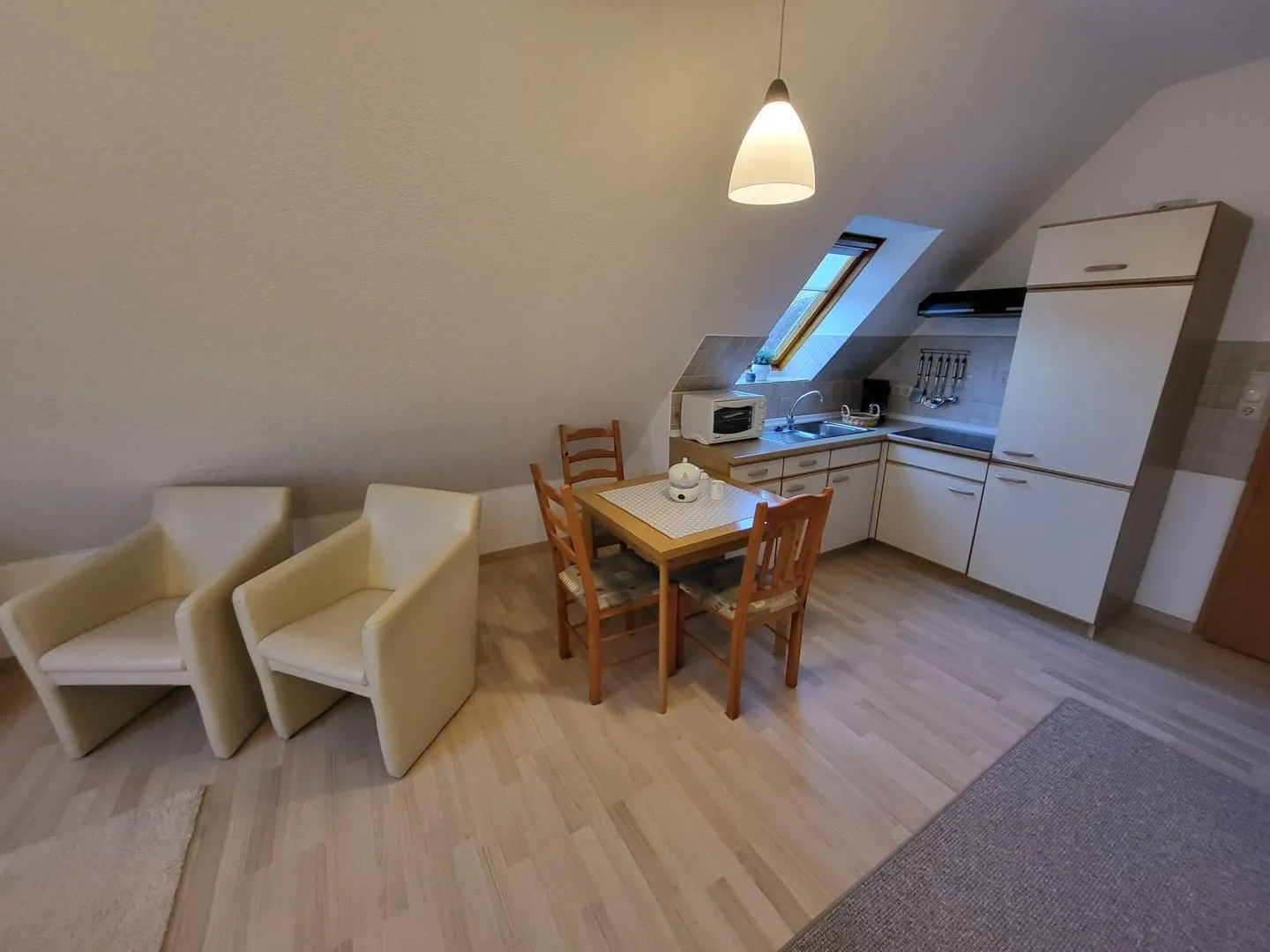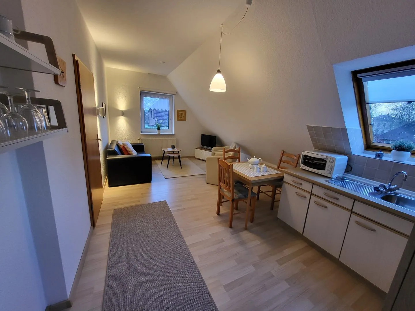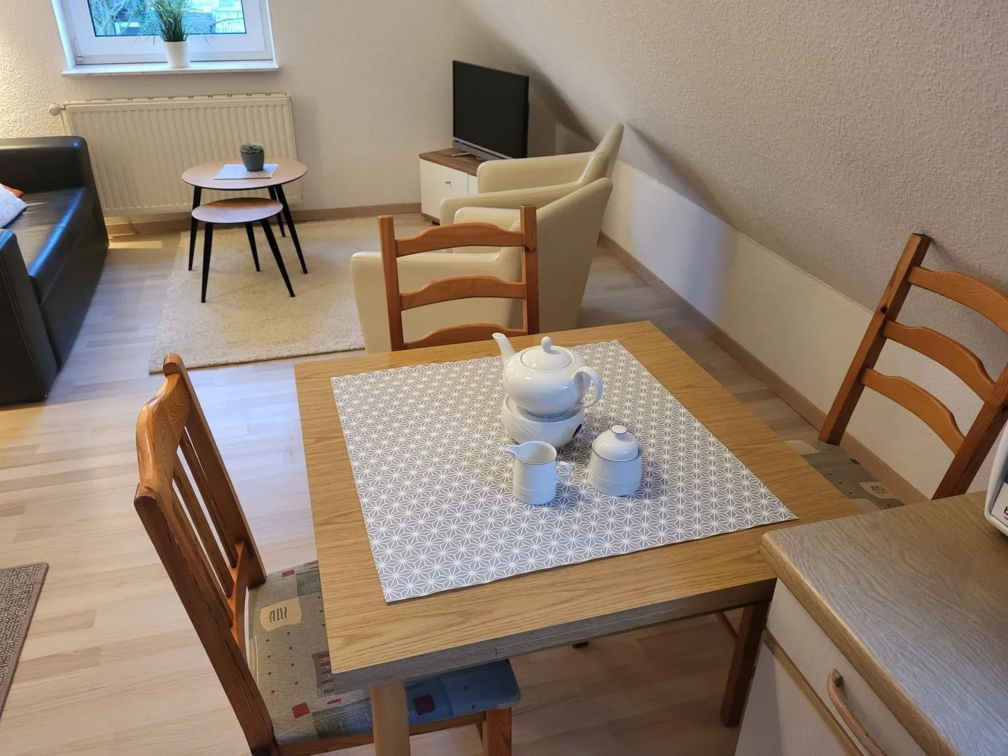 Im Wohn-/Essbereich mit Küche können Sie Ihren Urlaub genießen. Die gemütliche Couch lädt zu entspannten Abenden bei einem Gläschen Wein und spannenden Filmen ein. In der gut ausgestatteten Küchenzeile (Spülmaschine ist in Planung) können Sie Ihren Kochkünsten freien Lauf lassen und am Esstisch tolle Speisen servieren. Die Sitzgruppe ist ebenfalls perfekt um bei einer Tasse Ostfriesentee zu Klönen. Nebenan befindet sich das Schlafzimmer mit Doppelbett. Genießen Sie die ruhigen Nächte. Vom Flur gelangen Sie in ein weiteres Schlafzimmer mit einem Einzelbett. Das Duschbad mit Fenster und ein Abstellraum runden das Obergeschoß ab. WLAN ist verfügbar. Zur Wohnung gehört im Garten noch eine gemütliche separate Terrasse zum Relaxen und frische Nordseeluft schnuppern. 2 Parkplätze stehen zur Verfügung. Ein Schuppen zum Unterbringen mitgebrachter Fahrräder ist vorhanden.