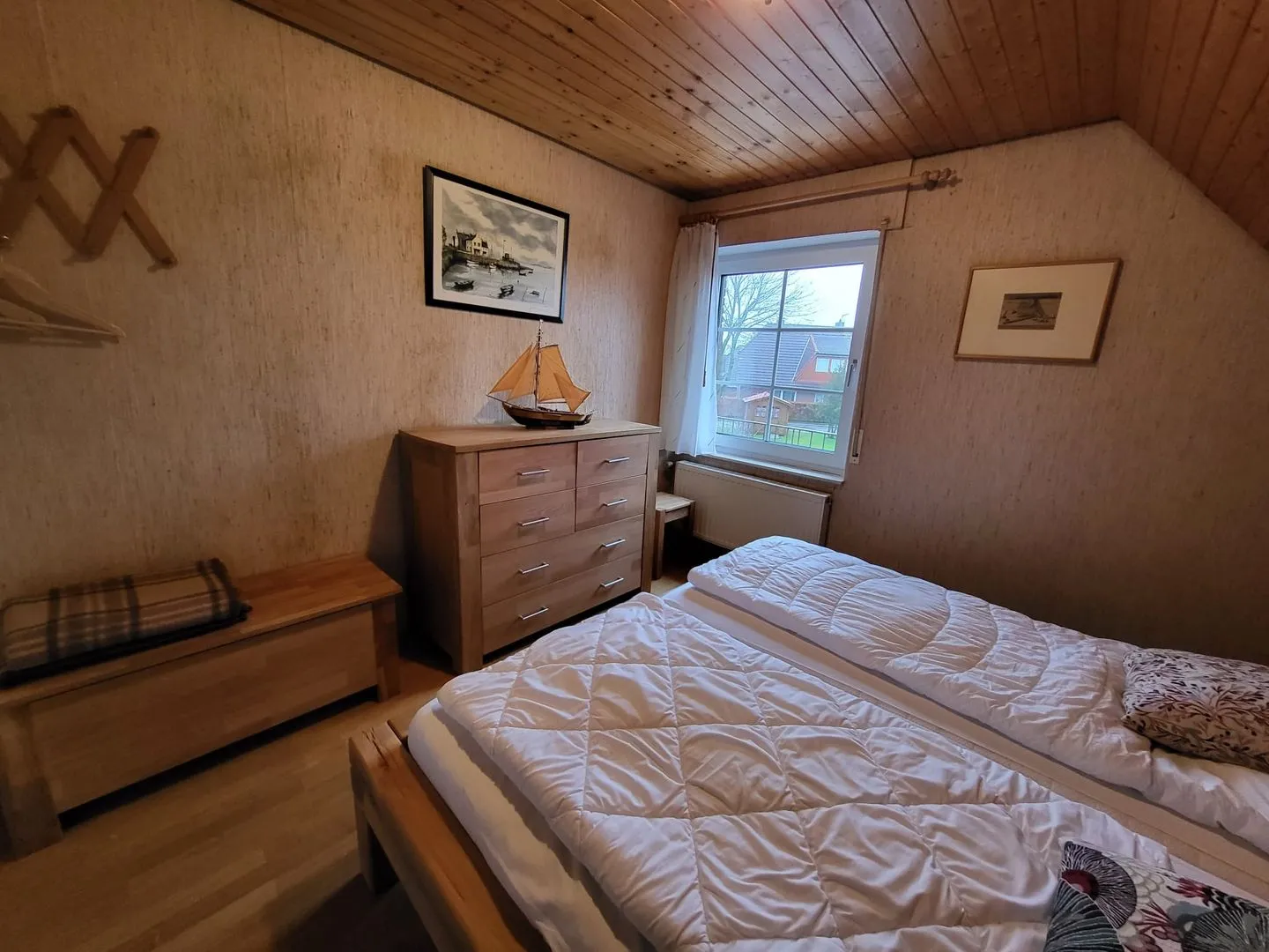 Die Ferienwohnung liegt im Obergeschoß eines Vier-Parteienhauses im ruhigen Ortsteil von Greetsiel nur wenige Gehminuten vom Zentrum entfernt. Der Wohnbereich verfügt u. a. über eine Couchgarnitur, einen Relaxsessel und Flachbild TV und lädt zu gemütlichen Abenden ein. Von hier gelangen Sie auf den Balkon, wo Sie die Ruhe genießen können. Neben dem Wohnzimmer befindet sich die helle Küche mit einem Esstisch und einer gemütlichen Bank. Die Küchenzeile bietet ein Cerankochfeld, Backofen, Geschirrspüler, Kaffeemaschine, Wasserkocher etc. Neben der Küche gibt es noch einen kleinen Abstellraum mit Waschmaschine, Staubsauger usw. Vom Flur aus geht es ins geräumige Badezimmer mit Dusche und WC. Ein Fön ist vorhanden! Nebenan befindet sich das Schlafzimmer mit Doppelbett und großem Kleiderschrank. Vom Wohnbereich führt eine Raumspartreppe in das Dachgeschoß, wo sich noch 2 Einzelbetten befinden. Die Betten sind durch eine Holzwand abgetrennt. Alle Fenster (bis auf das Dachgeschoß) sind mit Außenrollos ausgestattet. Ein Parkplatz befindet sich vor dem Haus.