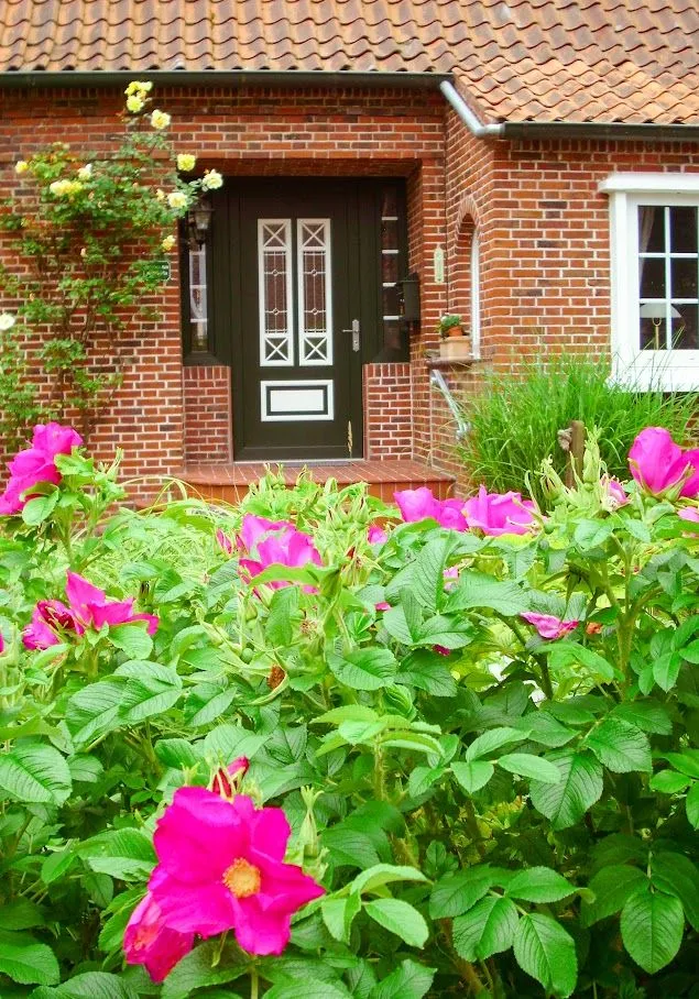 Apfelrosenhecke: Der Garten wird das ganze Jahr über gepflegt, besonders schön sind die Apfelrosenhecken, wenn sie blühen.